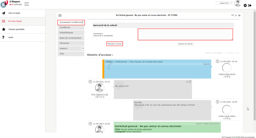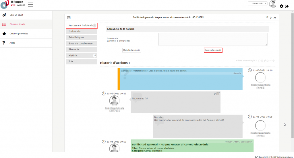 Un cop resolta la teva sol·licitud o incidència rebràs un correu de notificació especificant com s’ha resolt el tema. Si vols acceptar la resolució o rebutjar-la només cal que accedeixis al tiquet directament a URespon. Fes clic a l’opció “Processant incidència” que apareix al menú esquerre i veuràs un requadre amb el títol “Aprovació de la solució”.
