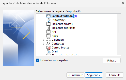 - Selecciona les carpetes que vols exportar (pots triar tota la bústia).