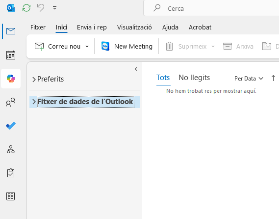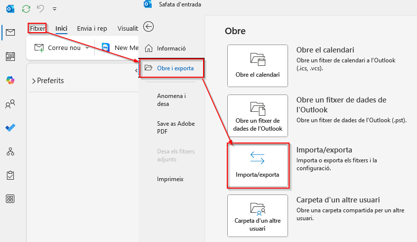 - Ves a Fitxer → Obre i exporta → Obre fitxer de dades d’Outlook.