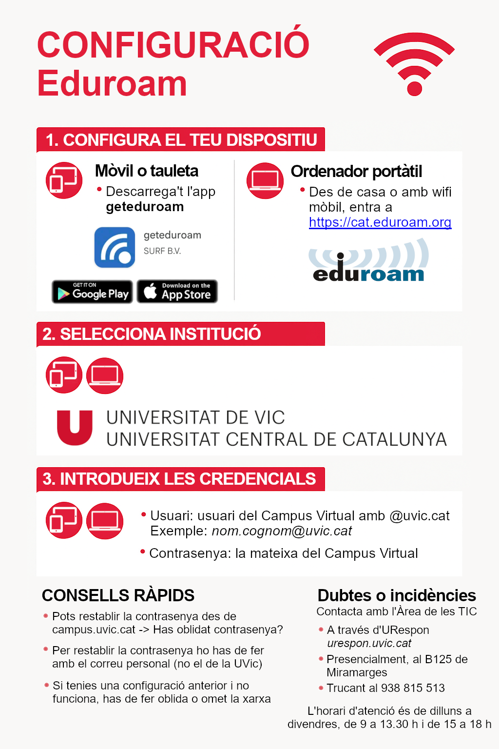 Tota persona que forma part de la comunitat universitària de la UVic té accés a la xarxa Wi-Fi Eduroam. Aquest accés es pot efectuar des de qualsevol de les instal·lacions de la UVic com també des de qualsevol altre universitat o institució educativa adscrita a la xarxa Wi-Fi Eduroam i és vàlid mentres formis part de la comunitat universitària.