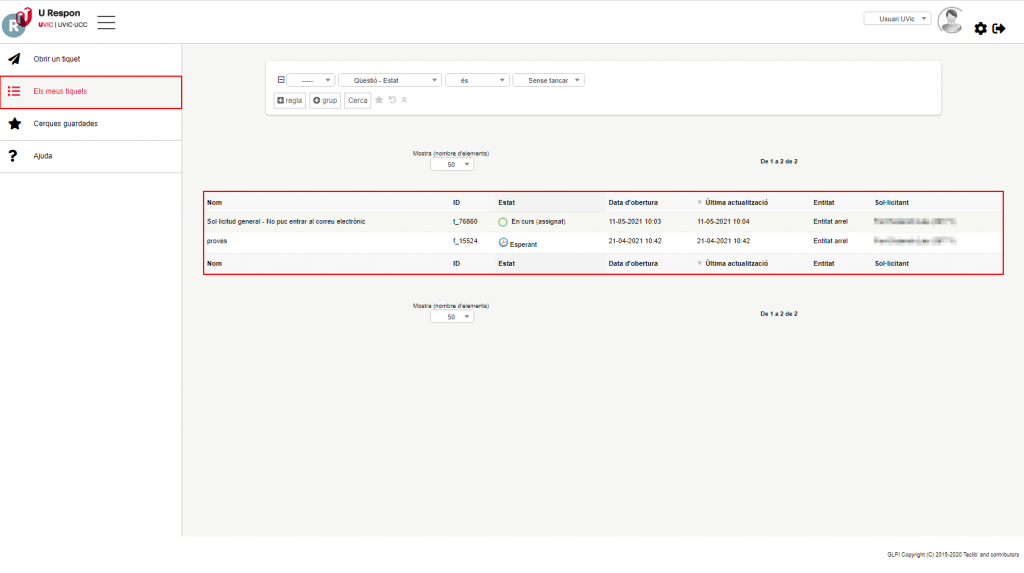 1. Facis clic a la barra superior on posa “Les meves sol·licituds d’assistencia”. Escullis la que vulguis consultar i facis clic sobre ella