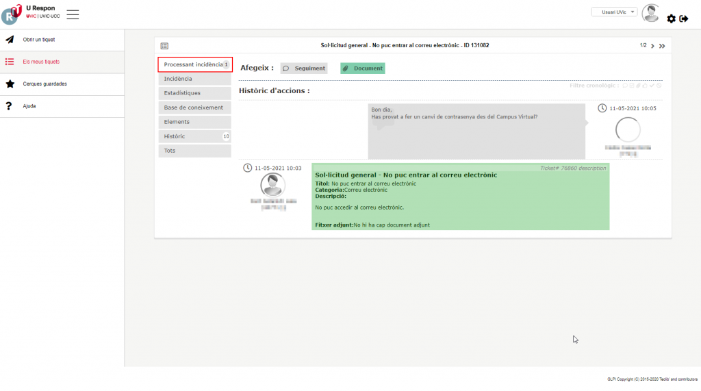 2. A l’esquerre veuras un llistat d’opcions. Fes clic a “Processant incidència” i podràs veure tots els seguiments.