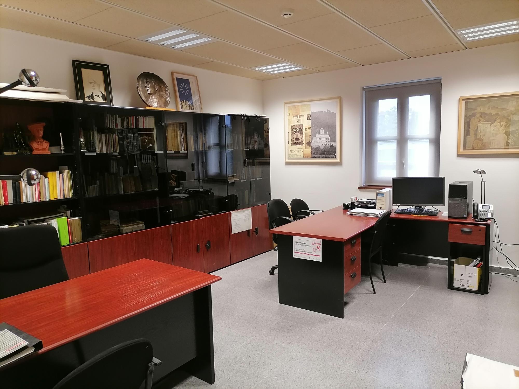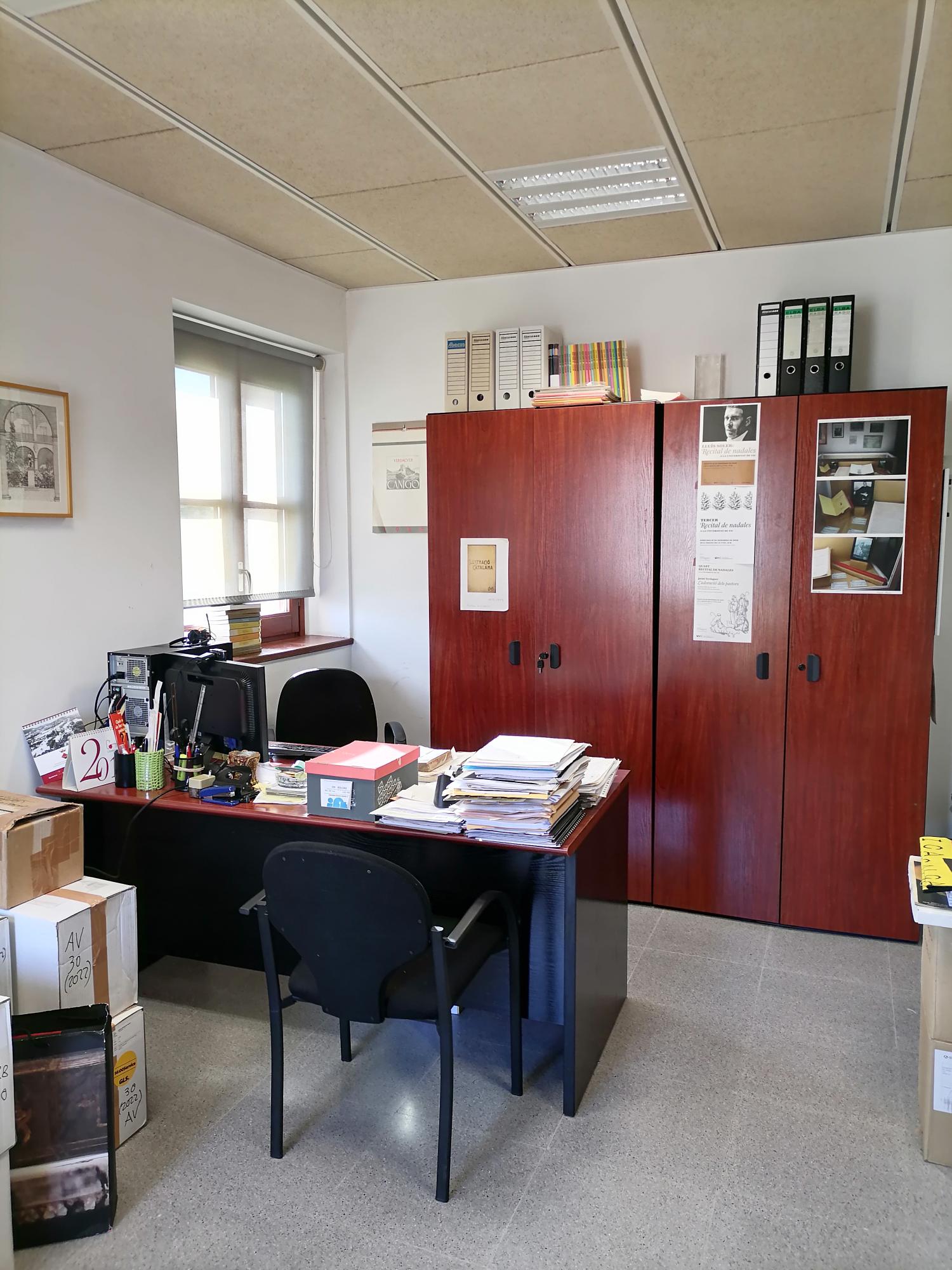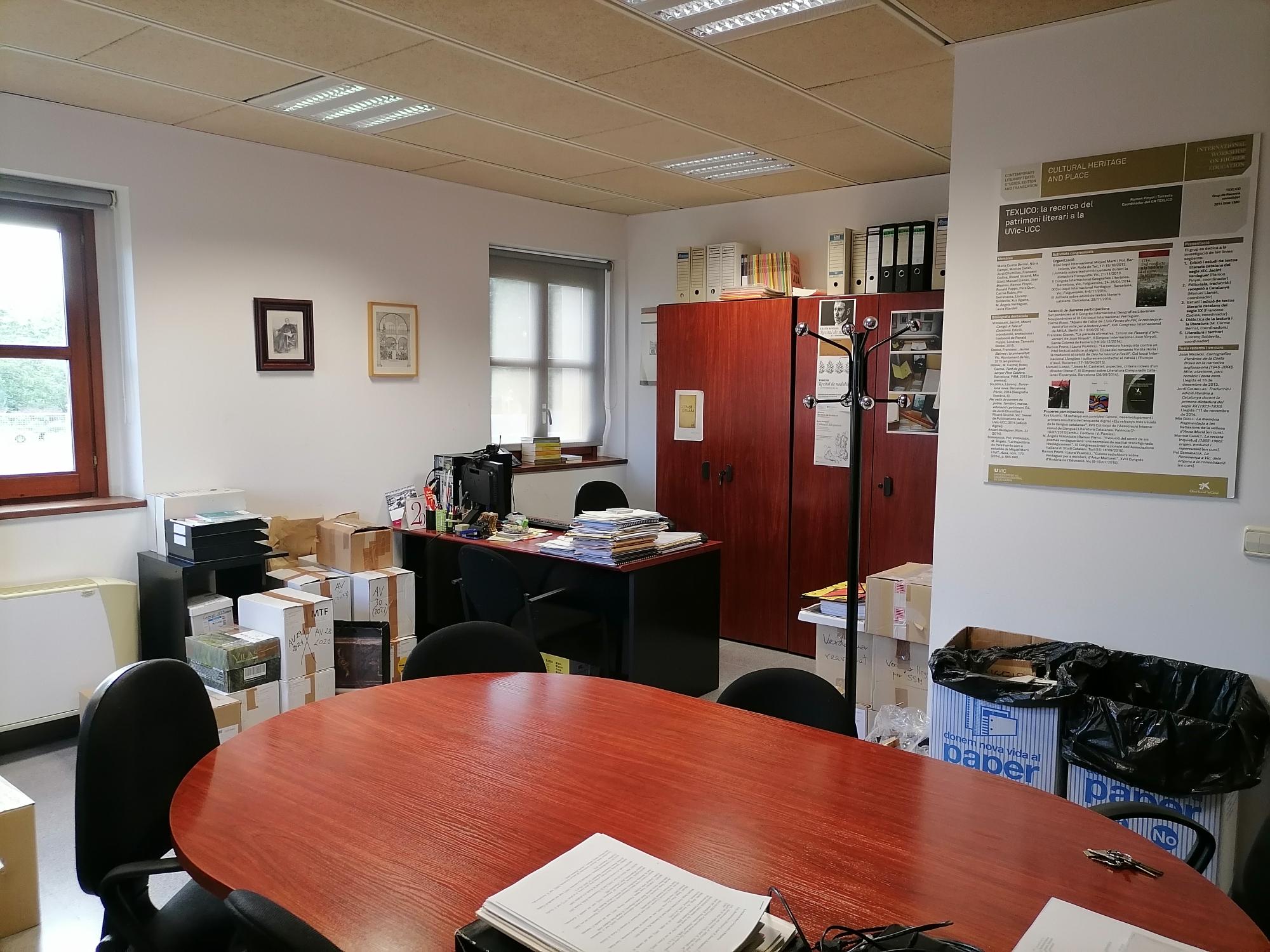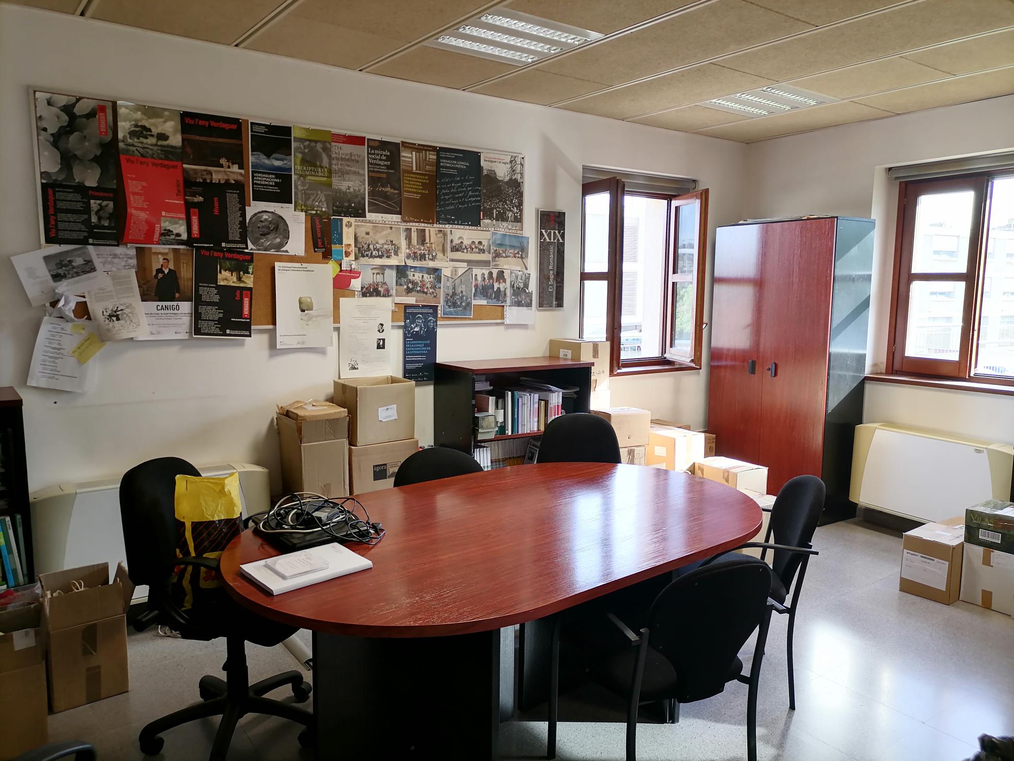 Aquesta setmana (10-13 de juliol de 2023) la Càtedra Verdaguer d’Estudis Literaris ha hagut de traslladar-se a un altre lloc. Per això, ha hagut de deixar els dos espais de la Masia de la Torre dels Frares (primer pis) –vegeu les fotografies dels dos despatxos (Masia 1 i Masia 2)– i ha passat als petits espais T002 i T006 de l’Edifici Torre dels Frares.
