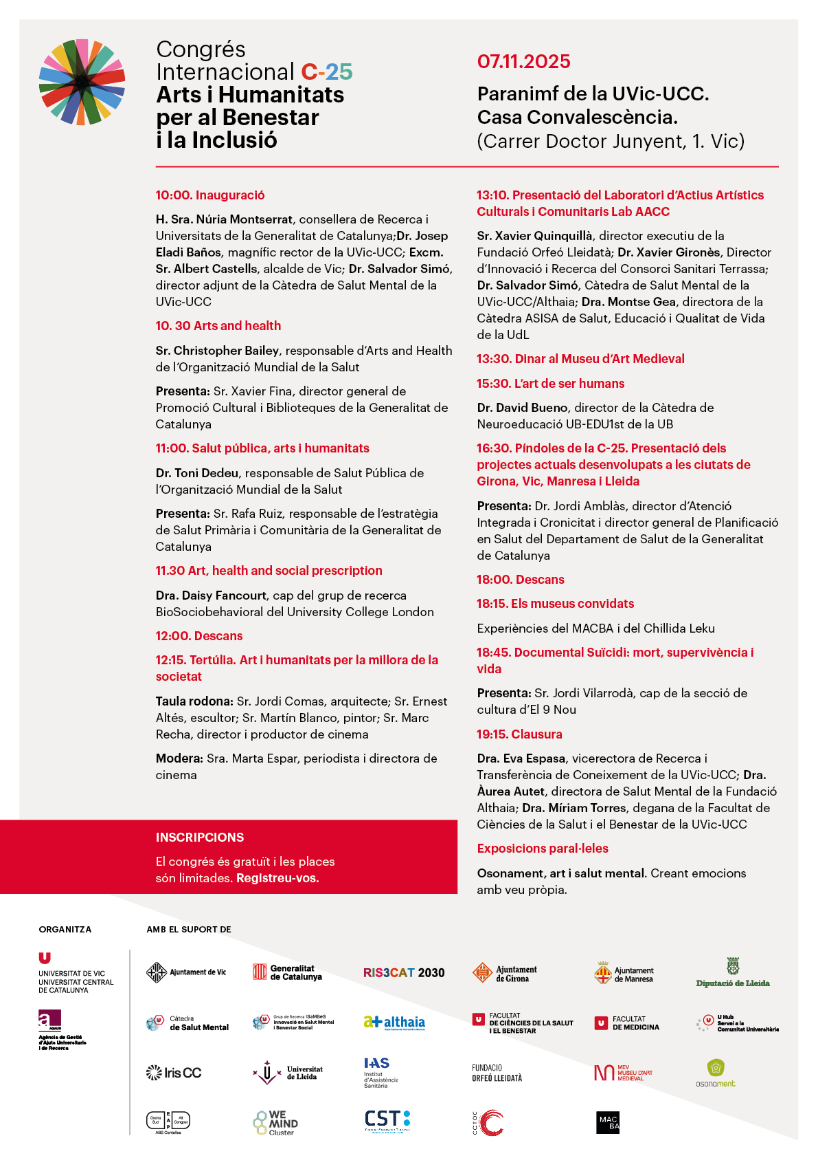 El pròxim 7 de novembre la nostra Càtedra i el GR ISAMBES organitzen la primera edició del Congrés Internacional C-25 Art i Humanitats per al Benestar i la Inclusió, al Paranimf de la UVic-UCC, amb la presència de l’H. Sra. Núria Montserrat, consellera de Recerca i Universitats de la Generalitat de Catalunya.