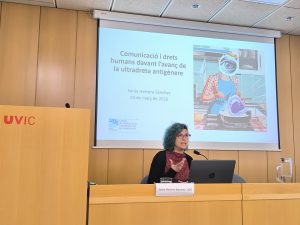 La jornada es va completar amb la conferència “Comunicació i drets humans davant l’avenç de la ultradreta antigènere”, a càrrec de la professora i investigadora de la UOC Sonia Herrera, experta en educomunicació i estudis feministes, que va abordar els reptes actuals en la construcció de relats mediàtics i el seu impacte en la garantia dels drets fonamentals. A tall de contextualització, Di Masso va fer referència a la Taula commemorativa del 50 aniversari de les Jornades Catalanes de la Dona i a l’efemèride dels 50 anys del cop d’estat a l’Argentina, el 24 de març del 1976, i el fil conductor entre els dos esdeveniments amb relació a la necessitat de la memòria històrica per defensar drets i llibertats en un moment d’auge del negacionisme de la ultradreta.