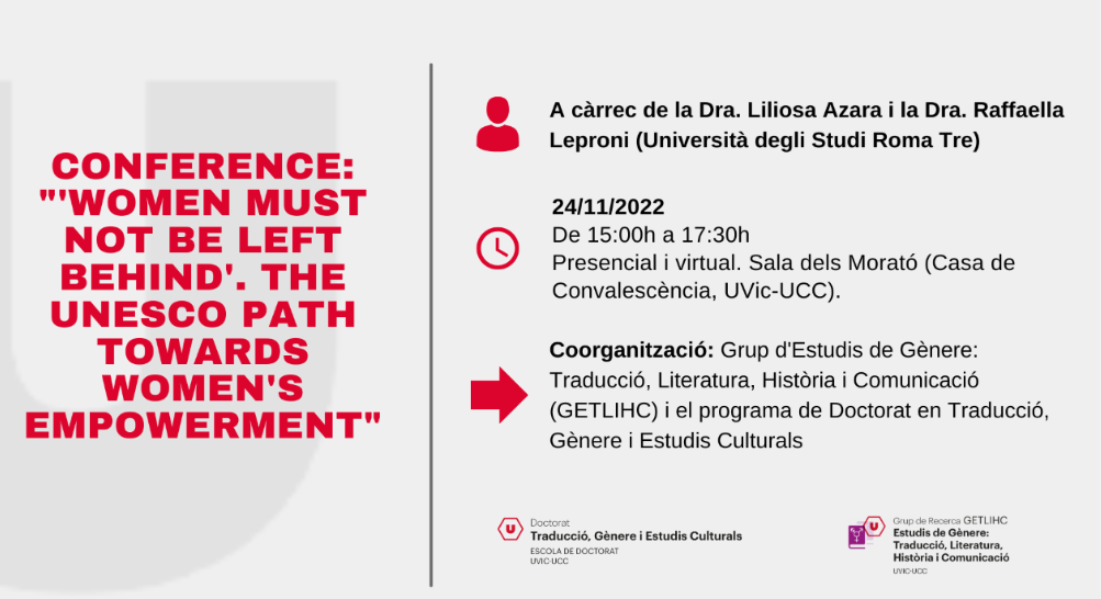 Us informem que el dijous 24 de novembre, de les 15.00h a les 17.30h, tindrà lloc la conferència “‘Women must not be left behind’. The UNESCO path towards women’s empowerment”. La conferència serà en anglès i anirà a càrrec de la Dra. Liliosa Azara i la Dra. Raffaella Leproni, de la Università degli Studi Roma Tre. L’acte serà en modalitat híbrida. S’hi podrà assistir de forma presencial, a la sala dels Morató de la Casa Convalescència (2a. planta) de la UVic-UCC, o en format virtual, a través de l’enllaç Zoom següent: