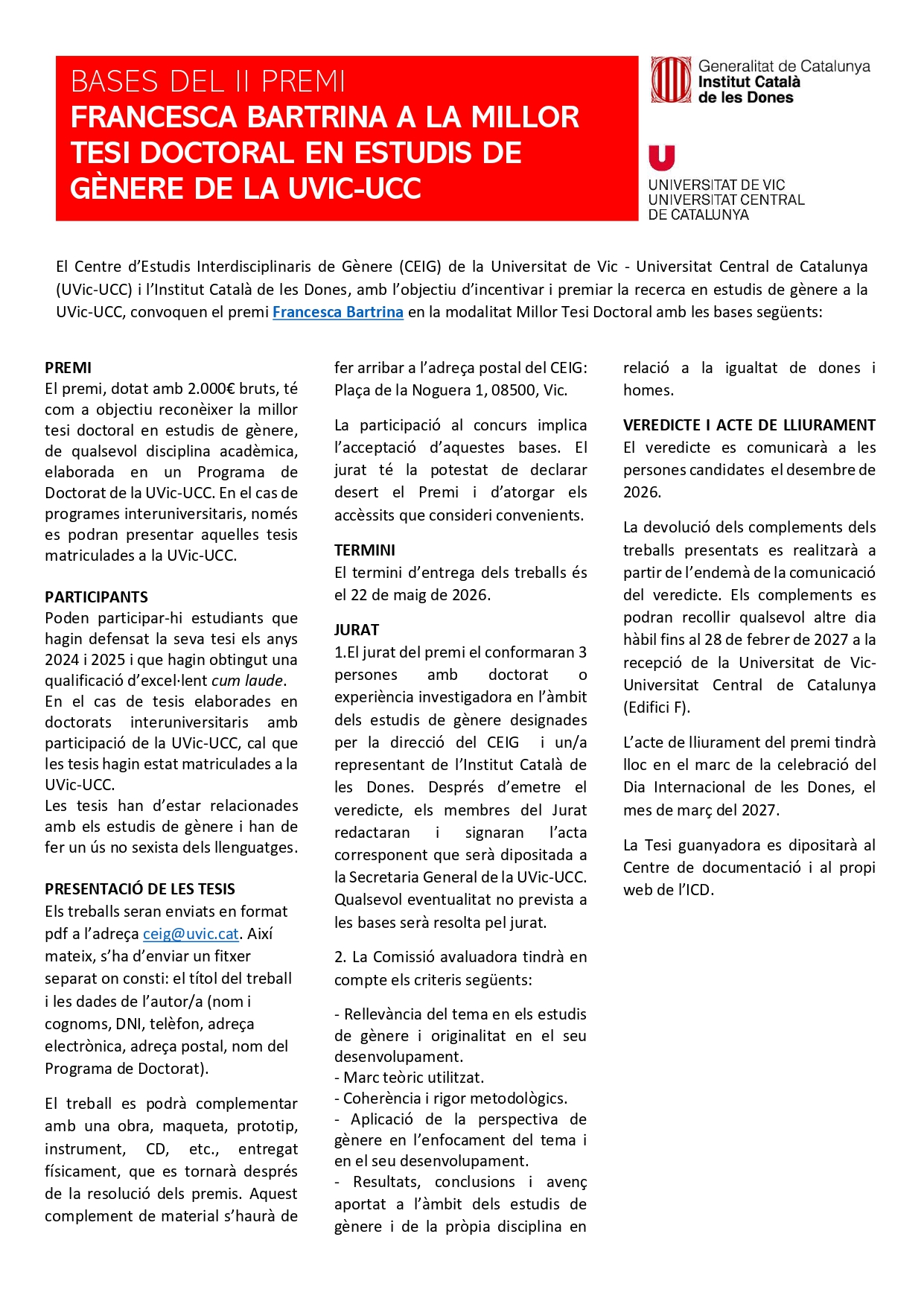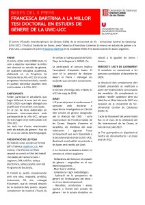Des del Centre d’Estudis Interdisciplinaris de Gènere (CEIG) convoquem la II edició del Premi Francesca Bartrina a la millor Tesi doctoral en estudis de gènere. El premi, dotat amb 2.000€ bruts, té com a objectiu reconèixer la millor Tesi doctoral en estudis de gènere, de qualsevol disciplina acadèmica i elaborada en un Programa de Doctorat de la UVic-UCC (en el cas de programes interuniversitaris, només es podran presentar aquelles tesis matriculades a la UVic-UCC).