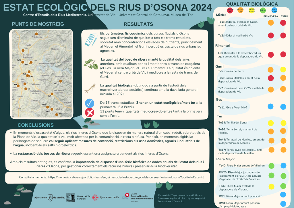 El CERM duu a terme des de l’any 2002 un seguiment regular de l’estat ecològic dels cursos fluvials d’Osona, amb el propòsit de, si s’escau, corregir-ne possibles disfuncions.