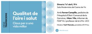 La conversa estarà moderada per la periodista Txell Vilamala i vol obrir un espai de reflexió accessible a tothom sobre com la qualitat de l’aire condiciona la nostra salut i quines mesures poden contribuir a millorar-la.