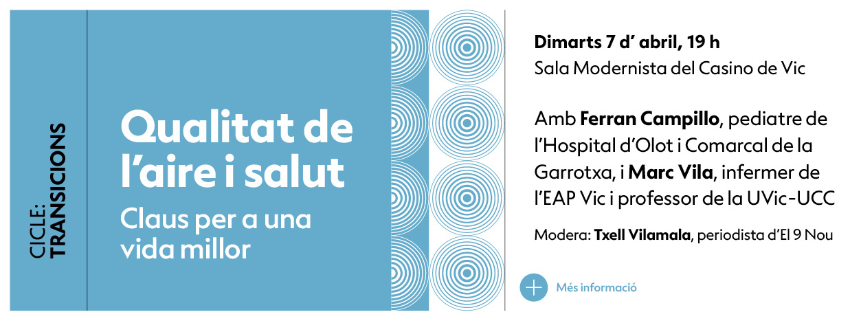 L’acte comptarà amb la participació de Ferran Campillo, pediatre de l’Hospital d’Olot i Comarcal de la Garrotxa, i Marc Vila, infermer de l’EAP Vic i professor de la UVic-UCC, que aportaran una mirada mèdica i científica sobre aquest repte ambiental.