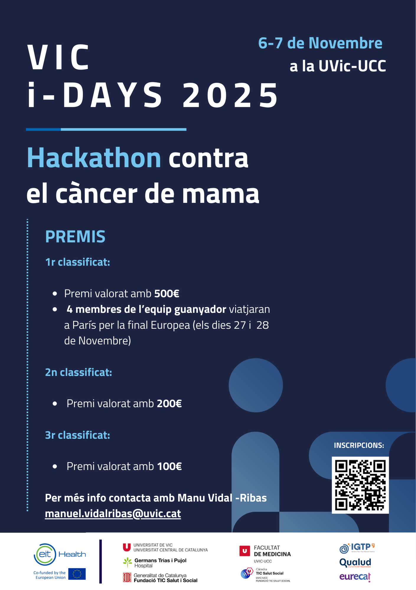 Els dies 6 i 7 de novembre, la Facultat de Medicina de la UVic-UCC acollirà la quarta edició dels Vic i-Days, una hackathon que planteja reptes per millorar el tractament i l’acompanyament de pacients amb càncer de mama.