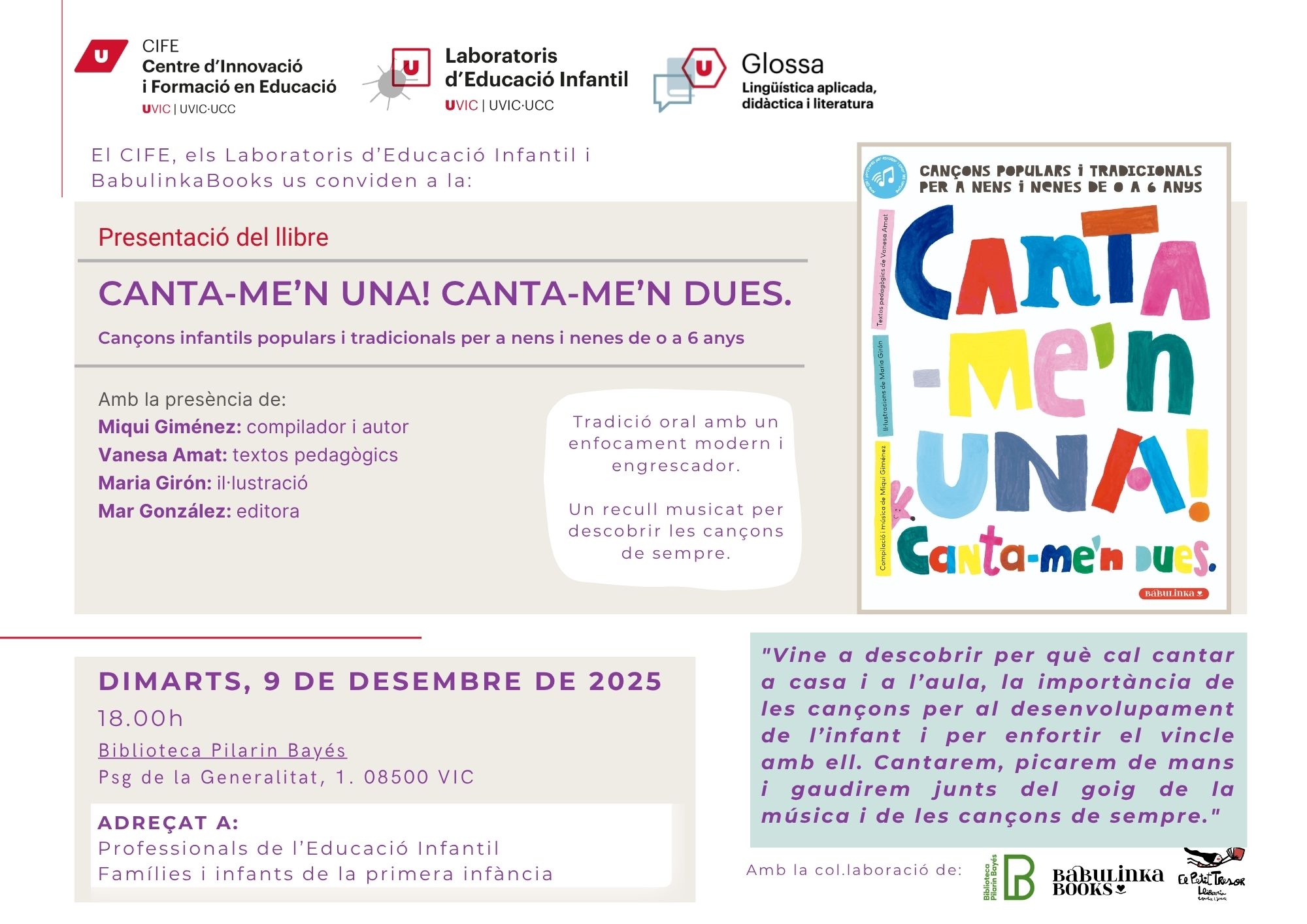 La jornada és gratuïta amb inscripció prèvia i finalitzarà amb la cloenda a càrrec de la Doctora Eva Espasa, Doctora Àurea Autet i Doct6ora. Míriam Torres, de la UVic-UCC.