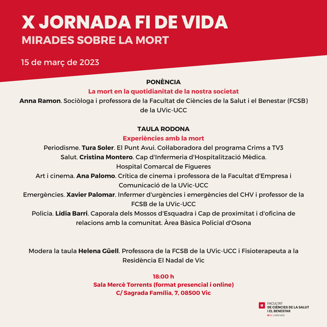 Sota el lema “Mirades sobre la mort”, més de cent persones, entre les quals estudiants, professionals de la salut i públic en general, van participar en la desena Jornada de Fi de Vida que va tenir lloc a la Sala Mercè Torrents i en línia ahir, 15 de març. La jornada va reunir experts de diferents àmbits com el periodisme, el cinema, la infermeria o els cossos policials, que van explicar la mort des del punt de vista de cada professió.