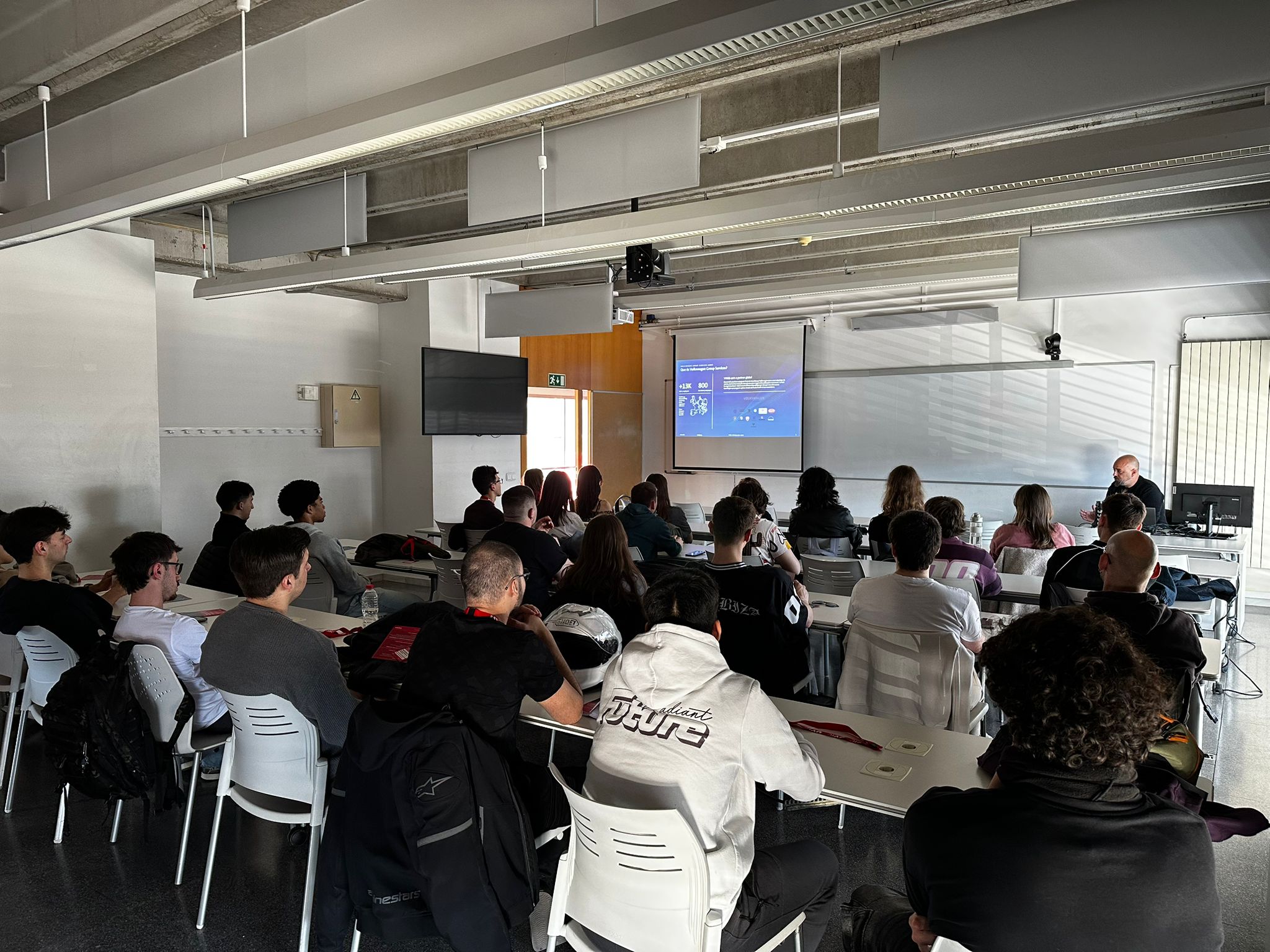 Un dels moments destacats del congrés va ser la intervenció de Marc Hernando, Engineering Service Manager de Volkswagen Group Services, que va presentar la ponència “Disseny, Prototipatge i Simulació en VR. El nou ecosistema digital de l’automoció”. Hernando va mostrar com tecnologies pròpies del desenvolupament de videojocs com: la realitat virtual (VR), la realitat augmentada (AR) i la realitat estesa (XR) s’han convertit en eines clau en els processos industrials i en la fabricació de vehicles. Els estudiants van poder conèixer casos reals d’ús on aquestes tecnologies optimitzen la presa de decisions, la formació d’equips i la simulació de processos productius.