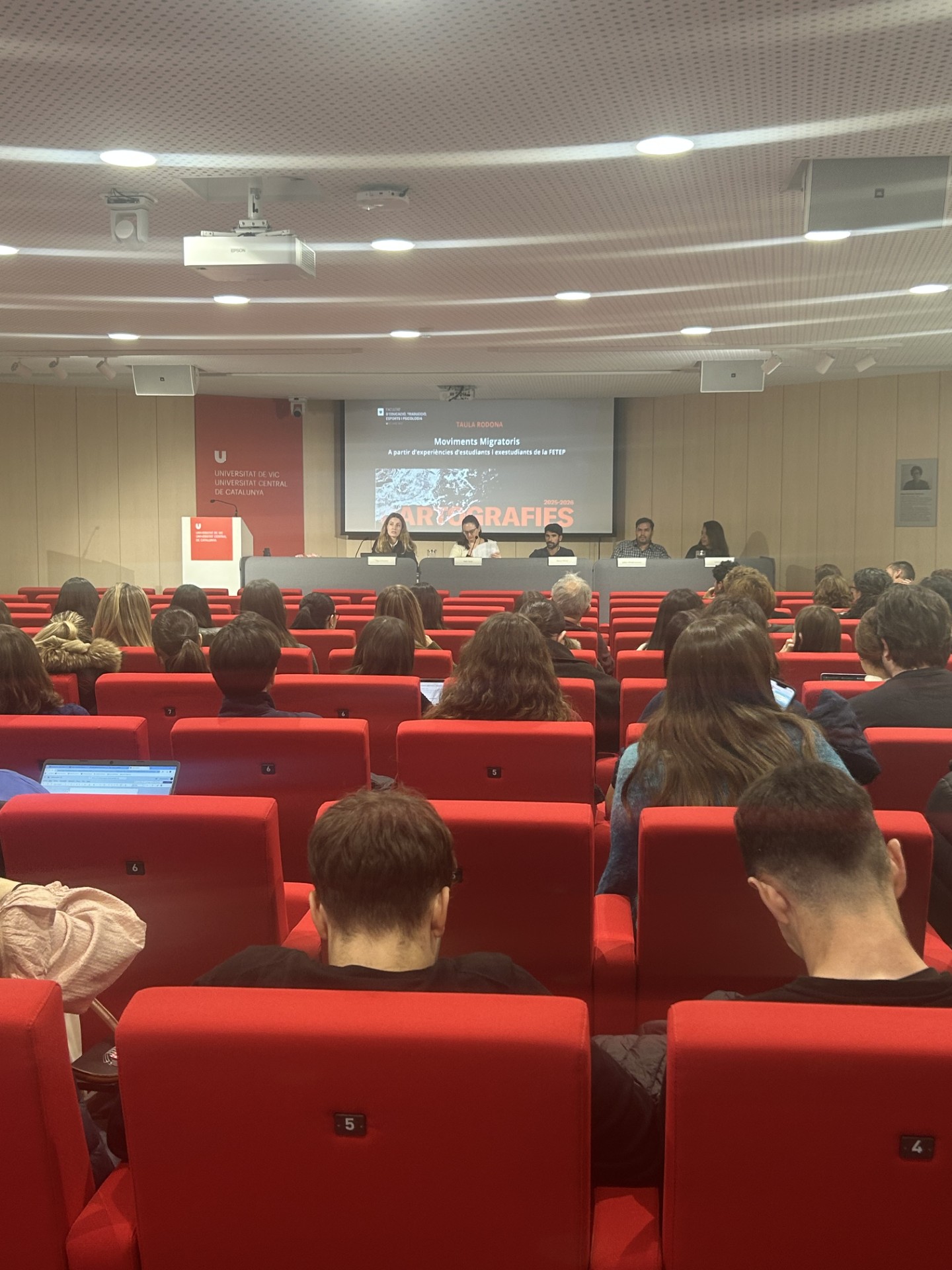 El passat dimecres 19 de novembre a la Sala Mercè Torrents va tenir lloc la taula rodona sobre Experiències Migratòries d’estudiants de la FETEP en el marc del cicle Cartografies de la UVic-UCC. L’acte tenia com a objectiu recollir les veus i els punts de vista d’estudiants, exestudiants i professorat de la FETEP per comprendre com les seves vivències havien configurat la seva vida professional i acadèmica.