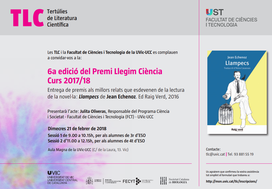 RELATS 2017/18 Relats presentats en el concurs Premi Llegim Ciència de la UVic-UCC el curs 2017/18, a partir de la lectura de la novel·la Llampecs Tots els RELATS (84 en total) presentats es troben aquí, els [...]