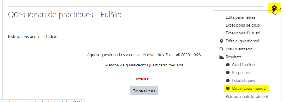 - Seleccionar la icona de configuració (a dalt a la dreta) i seleccionar “Qualificació manual”.