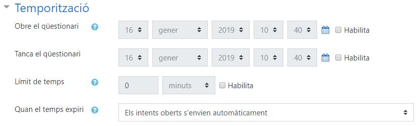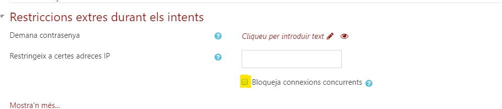 Una altre possibilitat, si fem servir les aules d’ordinadors, és restringir l’accés a la prova a un rang d’IPs específic. Així asseguraríem que no fessin la prova des de la Biblioteca, per exemple. La relació d’IPs de les aules d’informàtica dels espais Miramarges i Torre dels Frares es pot consultar al Campus Virtual > Comunitat > Informàtica > Qüestionaris Moodle IPs aules. Per a més detalls, també hi ha l’ajuda de Moodle (en anglès).