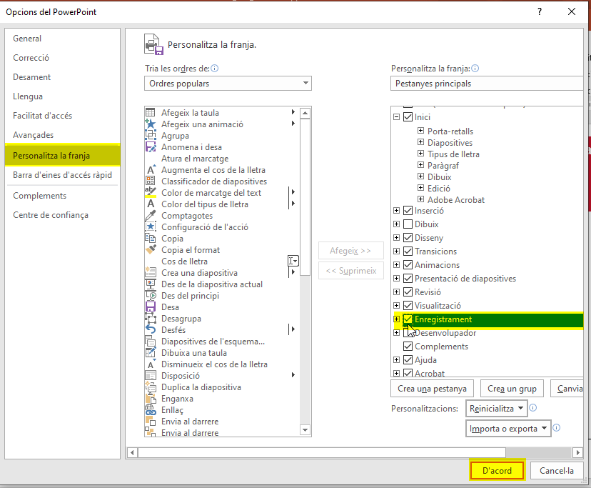 Aquesta acció fa que ens aparegui la pestanya “Enregistrament” en la cinta d’opcions de MS PowerPoint.