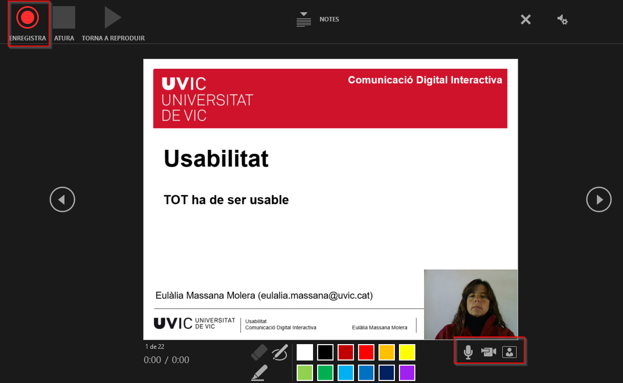 S’enregistrarà l’àudio/vídeo en cada una de les diapositives. Tenim un comptador de temps de la part inferior dreta que ens indica quin és el temps que invertim en cada diapositiva.
