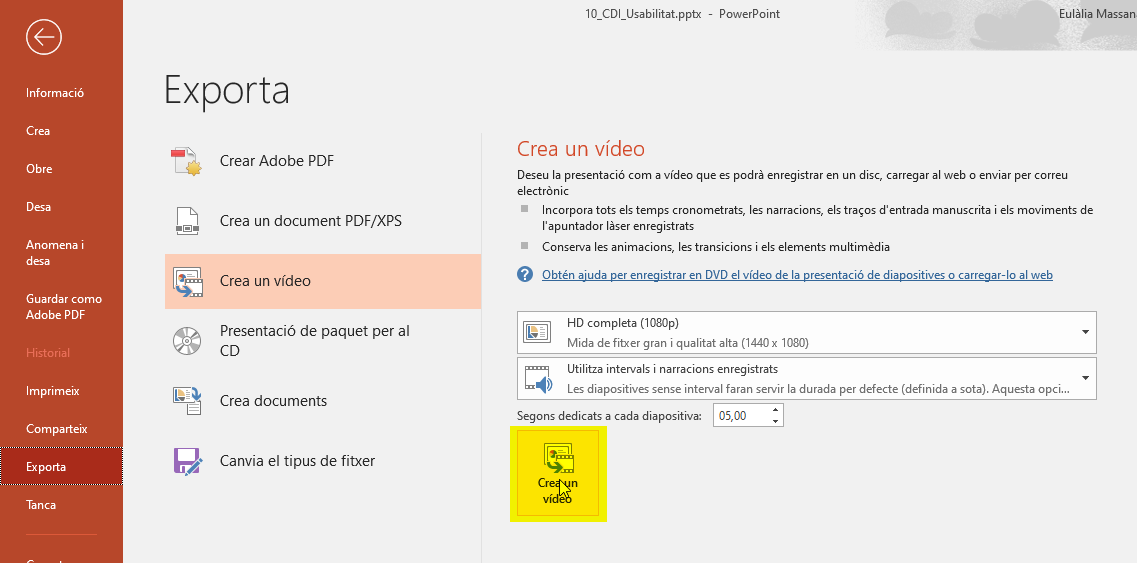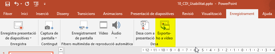 - Per fer un vídeo, cal seleccionar “Exportar-ho a vídeo”.