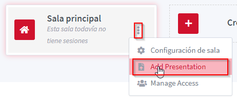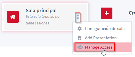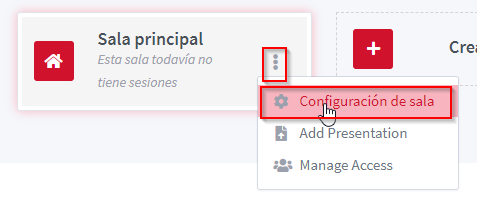 Dins les característiques de la sala podem seleccionar Configuración de sala, Add Presentation i Manage Access.