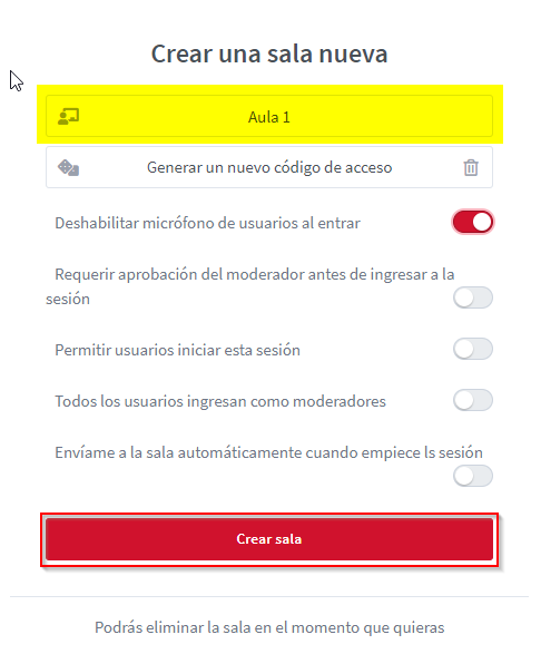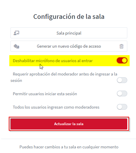 - Deshabilitar micrófonos de usuarios al entrar: si està activat, tots els participants estaran silenciats en iniciar la sessió.