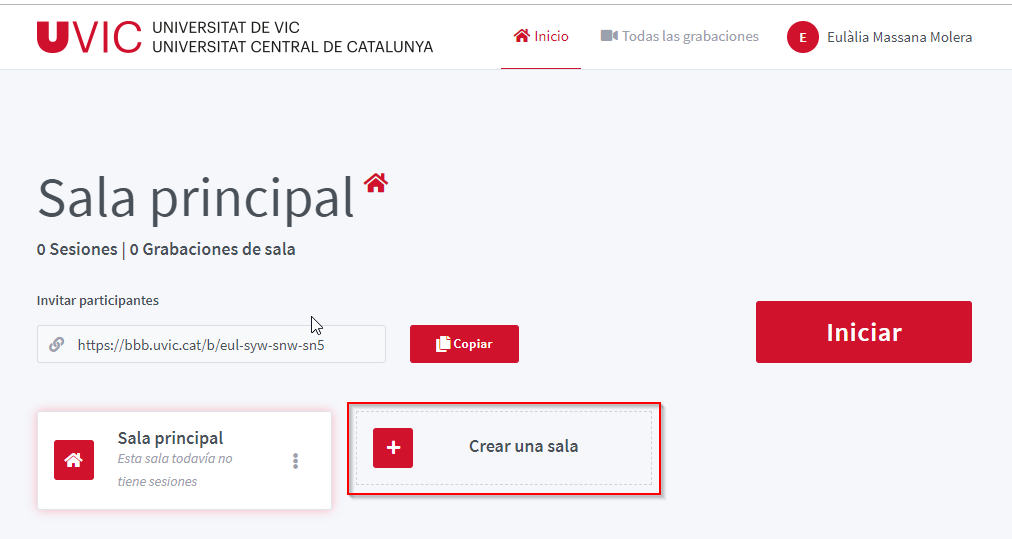 Per crear una altra sala cal clicar el botó Crear una sala de la pàgina principal. Aquesta funcionarà igual que la Sala principal.