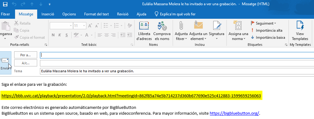 Si cliquem els tres punts verticals de la part de la dreta (3) podrem enviar un correu electrònic amb l’enllaç a l’enregistrament. Aquest enllaç també el podem copiar i enganxar allà on el vulguem distribuir.
