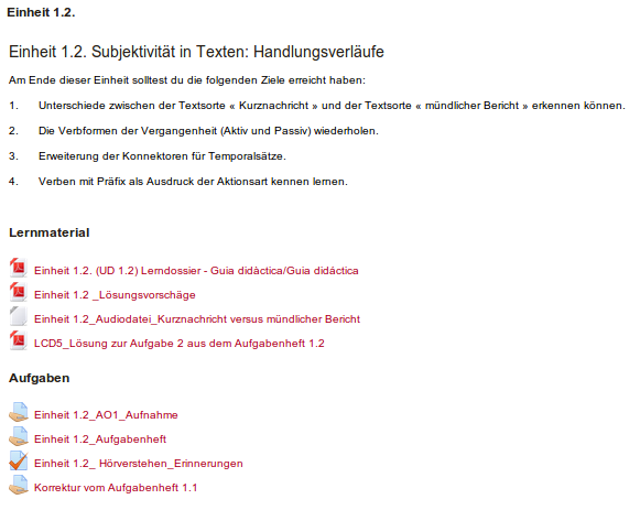 Les unitats es numeren començant per 1. S’ha d’incloure un breu resum dels continguts o dels objectius d’aprenentatge de la unitat. També es recomana marcar de manera adequada (icona bombeta de Moodle) la unitat que està activa en cada moment del curs. Després del text inicial, apareixen els materials i les propostes d’activitats.