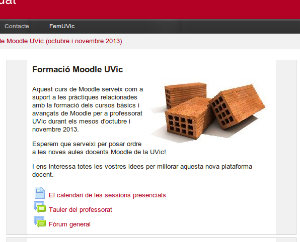 - Un fòrum de notícies, predeterminat a les aules Moodle, per comentar les novetats, i en el que només intervé el professorat. (Per evitar la possibilitat de confusió, es recomana retitular aquest fòrum “Tauler del professorat”.)