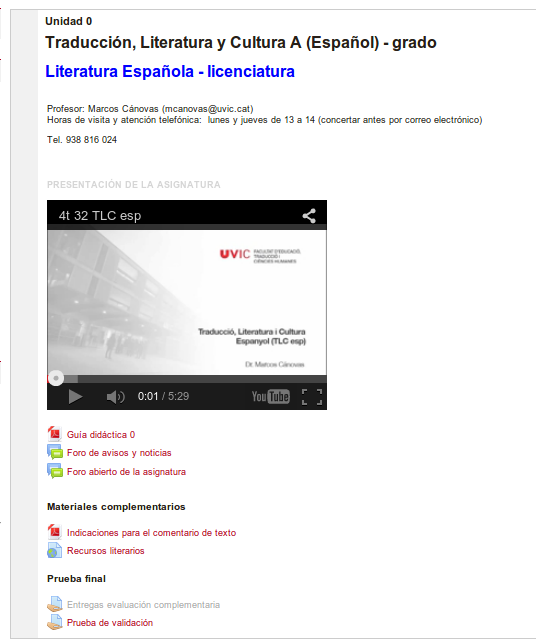 - Un vídeo (de 3 – 6 minuts) de presentació de l’assignatura i del professorat.