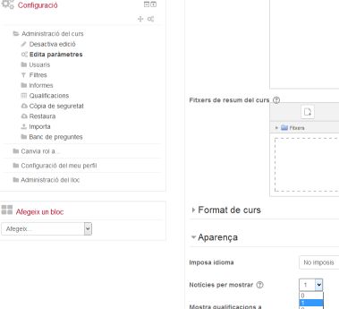 Aquests fòrums no es poden afegir a l’aula a través del diàleg normal de creació d’activitats. Per poder tenir un tauler de professorat hem d’anar al menú de l’esquerra Configuració > Administració de Curs > Edita paràmetres > Aparença > Notícies per mostrar > 1.