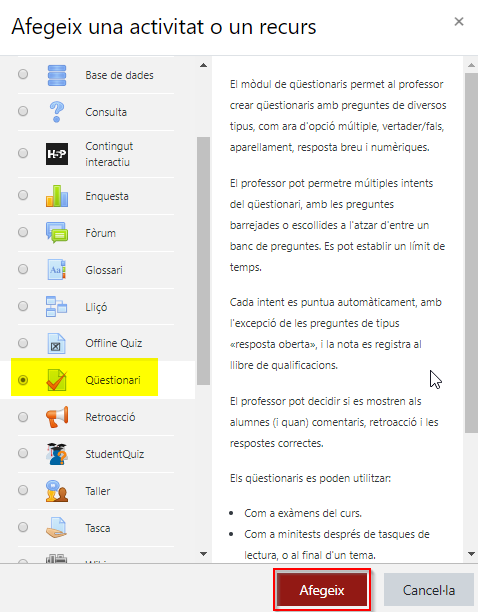En la finestra que s’obre, cal seleccionar el recurs Qüestionari i clicar Afegeix.