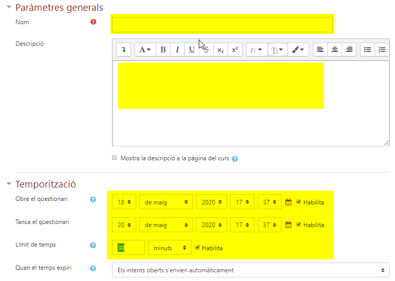En la configuració del qüestionari es poden determinar molts paràmetres, però no tots són obligatoris. Aquí n’expliquem alguns, D’altres els desenvolupem en altres entrades d’aquest blog.