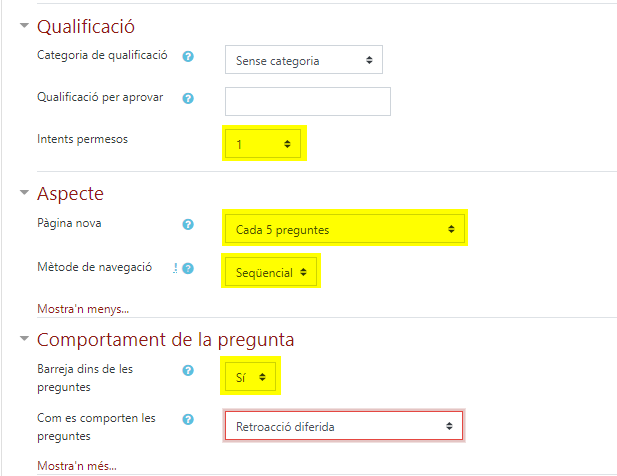 - Intents permesos: el nombre de vegades que un estudiant podrà fer un qüestionari