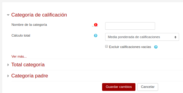 Supongamos que una parte de las actividades se consideran de autoevaluación y de realización optativa, mientras que otras son obligatorias. Las actividades de autoevaluación tendrán un peso menor en la nota final. Para conseguir esto crearemos dos categorías, “Actividades de autoevaluación” y “Actividades obligatorias”, y las daremos pesos y configuraciones diferentes.