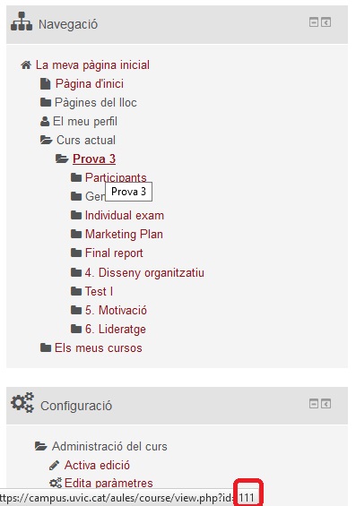 - ID Moodle de l’aula: Per saber quin és el ID de l’aula, passa el punter sobre del nom de l’aula (amb enllaç) i mira els últims dígits que apareixen a l’enllaç web que apareix sobre la barra d’estat e la finestra (al peu de la pàgina).