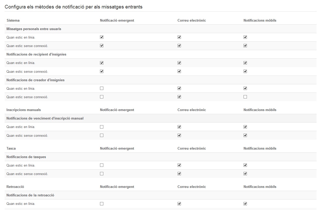 En aquesta pantalla podem configurar com rebre les notificacions de missatges generats a l’entorn de les aules virtuals. Les notificacions poden venir de diferents llocs o activitats: