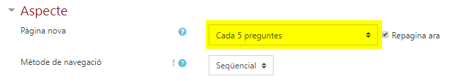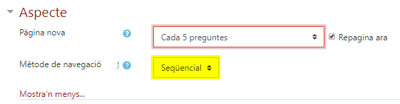 Podem configurar l’examen de manera que l’estudiant hagi de contestar les preguntes per ordre, sense possibilitat de retrocedir.- La finalitat és que no puguin reservar les preguntes més difícils per la part final, amb possibles consultes en equip no autoritzades. Aquesta opció és severa, ja que priva l’estudiant de la possibilitat de tornar a una pregunta difícil més tard, però evidentment pot servir per reduir les picaresques. Es deixa aquesta opció en mans de cada docent. Tècnicament, de cara a la gestió informàtica de l’examen, no cal. Per configurar el tipus de navegació permesa a l’estudiant en un qüestionari es pot definir en la seva configuració inicial o quan editem els paràmetres, a l’apartat Aspecte. Alerta! Aquesta restricció rep un rebuig important entre l’estudiantat.