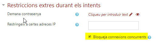I informar en la descripció del qüestionari que es bloquejarà l’intent de qüestionari si un cop iniciat s’intenta obrir des d’un altre navegador o ordinador. Només el professor/a ho podrà desbloquejar. Per activar aquesta opció en un qüestionari cal editar els seus paràmetres a l’apartat Restriccions extres durant els intents. Per defecte, a la UVic aquesta opció està desactivada, perquè pot donar lloc a un nombre excessiu d’alertes falses.- La finalitat en aquest cas és dissuasiva. La idea és que tinguin clar que només hi pot haver un usuari responent al mateix temps amb un determinat perfil. És evident que l’estudiant pot donar les seves credencials a un altre usuari i hi pot accedir en el seu nom i això no es pot evitar, però en cas de sospitar de suplantació podem recórrer als registres d’accés des de IP de l’alumne per veure si la IP des d’on s’ha respost el qüestionari és creïble (del rang que sol utilitzar l’estudiant en qüestió).