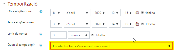 Seleccionar l’opció Quan el temps expiri: “Els intents oberts s’enviïn automàticament”.- La finalitat és guardar i enviar totes les respostes al servidor Moodle. Per activar aquesta opció en un qüestionari cal fer-ho des de la seva configuració inicial o quan editem els paràmetres, a l’apartat Temporització.