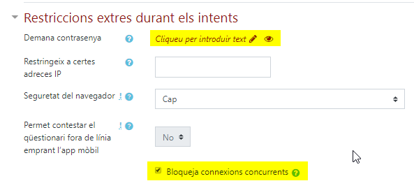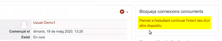 Si en la configuració del qüestionari, en l’apartat Restriccions extres durant els intents hem marcat Bloqueja connexions concurrents, el segon accés de l’estudiant queda bloquejat.
