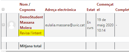 Hem de localitzar l’intent de l’estudiant i clicar a Revisa l’intent.