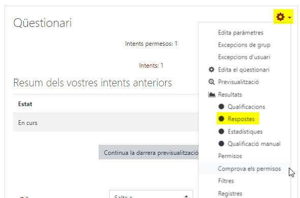 Per fer-ho, cal accedir al qüestionari, clicar a la rodeta dentada de la part superior dreta i seleccionar Respostes.