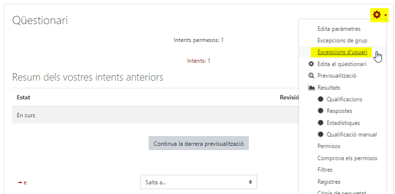 Cal entrar en el qüestionari, clicar la rodeta dentada de la part superior dreta i clicar l’opció Excepcions d’usuari.