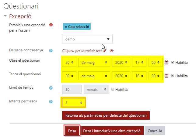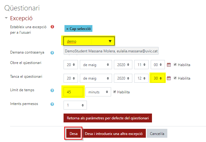 Podem modificar la data d’inici i tancament del qüestionari i/o el temps disponible des de l’inici de l’intent per a aquest estudiant. Cal clicar Desa.