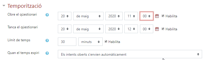 En el següent exemple, el qüestionari s’inicia el 20 de maig a les 11h i es tanca el mateix dia a les 12h. L’estudiant té 30 minuts des de que comença el seu intent fins que acaba.