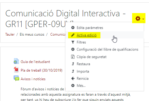 Per activar aquest bloc, cal entrar en el mode edició de l’aula, seleccionant la rodeta dentada de la part superior dreta de l’aula i clicar l’opció “Activa edició”.