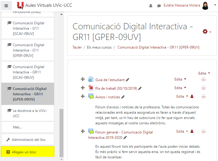 Cal desplaçar-se al llarg de la columna esquerra de l’aula i a la part inferior seleccionar l’opció “Afegeix un bloc”.